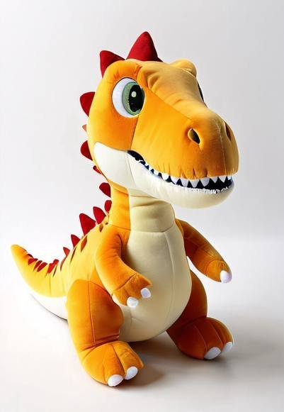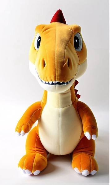 Ten pluszowy dinozaur w intensywnie pomarańczowym kolorze zachwyca swoim wesołym wyglądem i dużymi oczami. Jego miękkie futerko oraz staranne wykonanie czynią go idealnym towarzyszem zabaw.