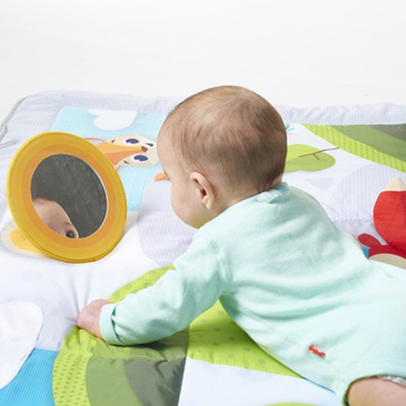- 0–6 miesięcy: Motoryka duża – leżenie na brzuszku. Pomóż dziecku spędzać więcej czasu na brzuszku, korzystając z różnych elementów na macie. Wskazuj kolorowe ilustracje, baw się szeleszczącym liściem i satynowymi wstążkami lub połóż dziecko przed bezpiecznym lustrem, aby zaczęło studiować swoje odbicie.