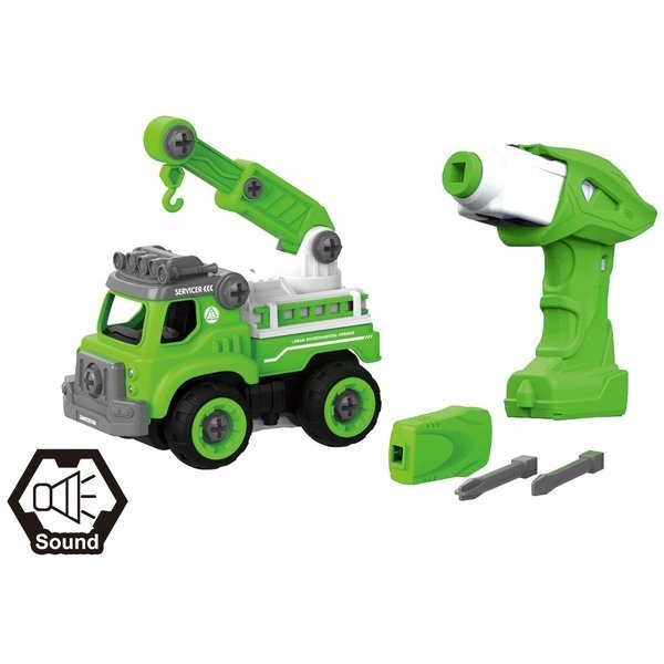 Przestrzenny dźwig budowlany DIY z silnikiem elektrycznym LM8044-DZ-1 CJ-1365129 składa się z 31 części, silnika elektrycznego i panelu sterowania. Zestaw zawiera śrubokręt krzyżakowy i płaski do montażu i demontażu maszyny. Właz kabiny jest otwierany, a sam dźwig jest ruchomy i działa. Jeździ tam i z powrotem, wydaje dźwięki alarmu po naciśnięciu przycisku na zderzaku.