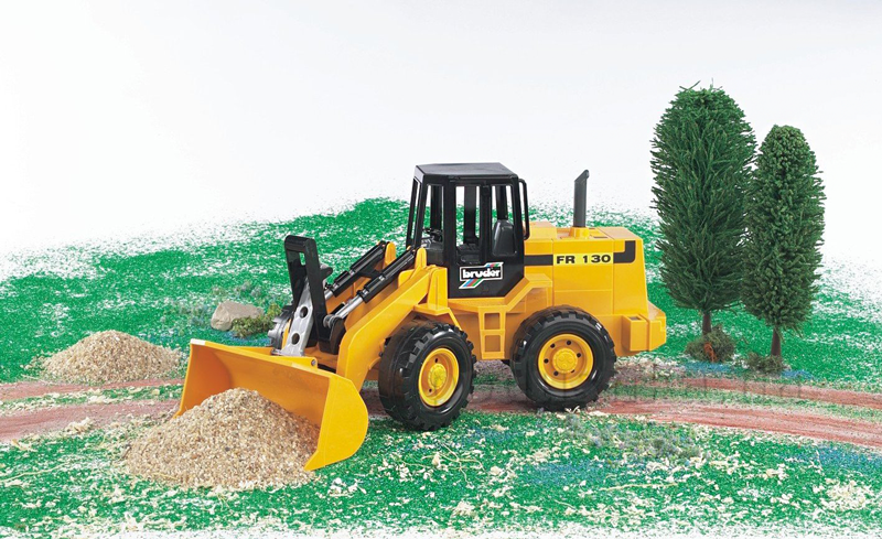 Ładowarka drogowa Bruder FR130, kopia prawdziwego sprzętu w pomniejszonej skali. Taka zabawka z pewnością spodoba się chłopcu, ponieważ jest bardzo podobna do prawdziwej ładowarki CAT. Cechą charakterystyczną tej maszyny jest duży podnośnik łyżki, który jest podnoszony i opuszczany za pomocą mechanizmu teleskopowego przy użyciu wygodnej dźwigni znajdującej się w pobliżu kabiny.