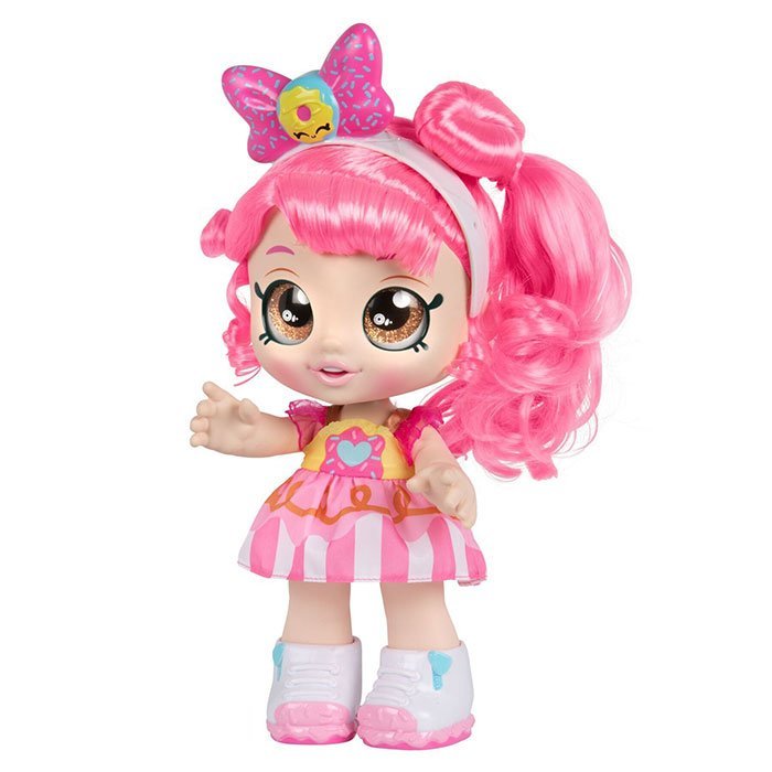 Lalka Kindi Kids Donatina z serii Snack Time Friends Moose 50006 przyniesie swojej właścicielce mnóstwo radości. To lalka Donat (donat). Pączki błyszczą w jej brązowych okularach z brokatem. Jedwabiste, różowe włosy wyglądają jak lukier do donutów. Jej obręcz i groszki – wzorem i wzorem przypominają tę bardzo popularną słodycz. Jeśli włożysz łyżeczkę do talerza, będzie on pełen jedzenia. A jeśli przyłożysz napełnioną łyżeczkę do buzi lalki, jej zawartość magicznie zniknie – dziecko je. A co najważniejsze, Donatina potrafi trzymać własną łyżeczkę.