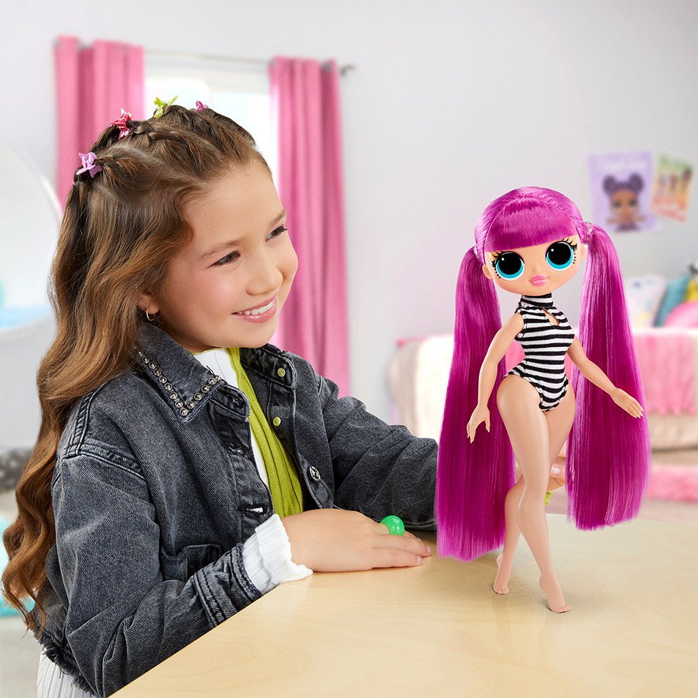 Duża i jasna lalka o wysokości 27 cm z przepięknymi długimi różowymi włosami i modnymi ubraniami.