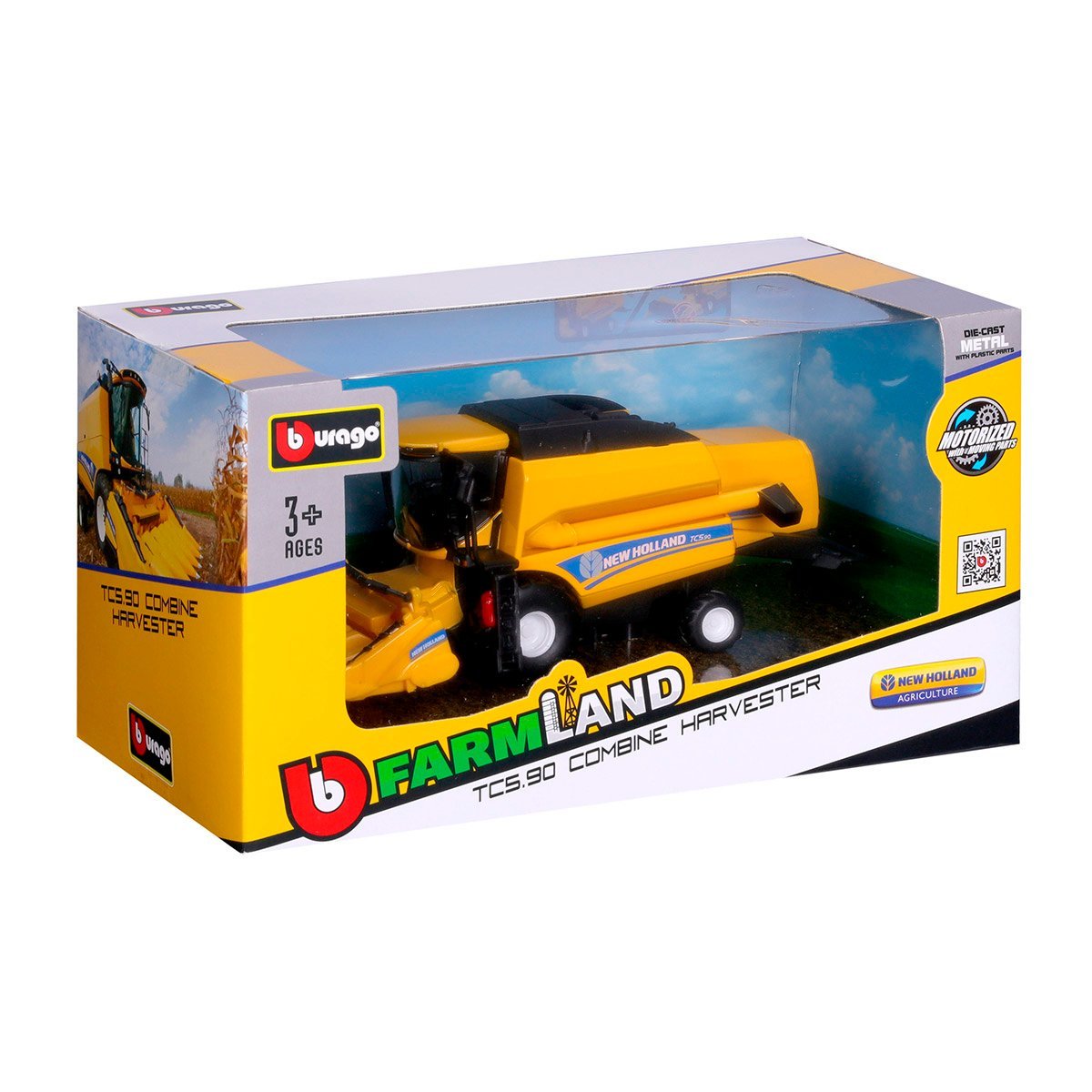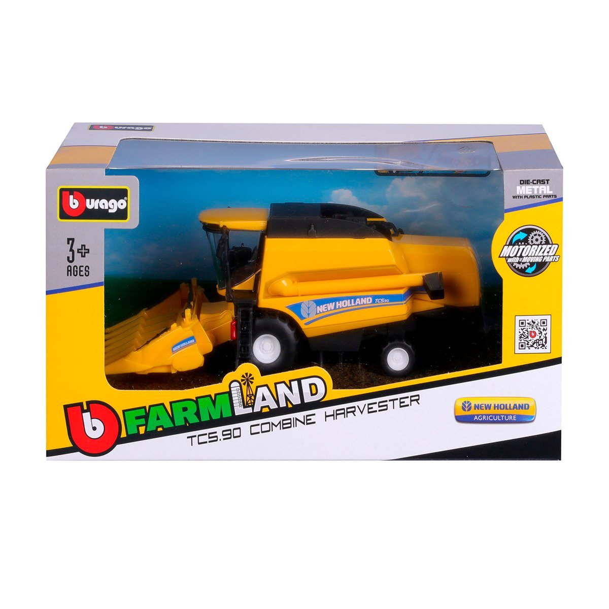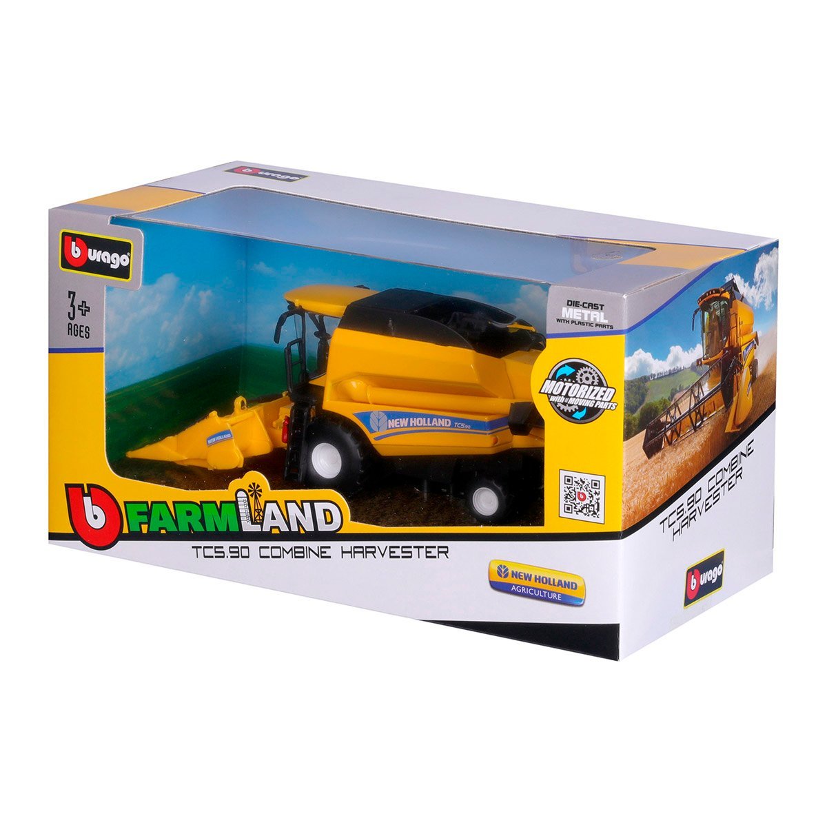 Model samochodu New Holland TC5.90 Bburago 18-31722 Kombajn zbożowy z przystawką do zbioru kukurydzy.