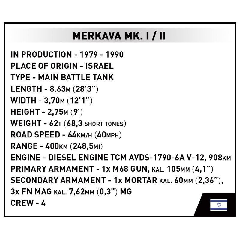 Model został odtworzony z 825 klocków Cobi, wiernie odzwierciedlając wygląd muzealnego prototypu. Ruchome elementy, takie jak wieża, działo, koła i gąsienice, nadają modelowi realizmu. Dostęp do odtworzonego silnika czołgu odbywa się przez właz serwisowy. Montaż modelu jest łatwy dzięki intuicyjnej instrukcji. Nadaje się dla kolekcjonerów sprzętu wojskowego, zwłaszcza do kolekcji Sił Zbrojnych, wraz z Leopardem 2A4, Leopardem 2A5 i Abramsem. Współpraca z Deutsches Panzermuseum Munster umożliwiła stworzenie realistycznego modelu muzealnego czołgu Merkava Mk. I/II.