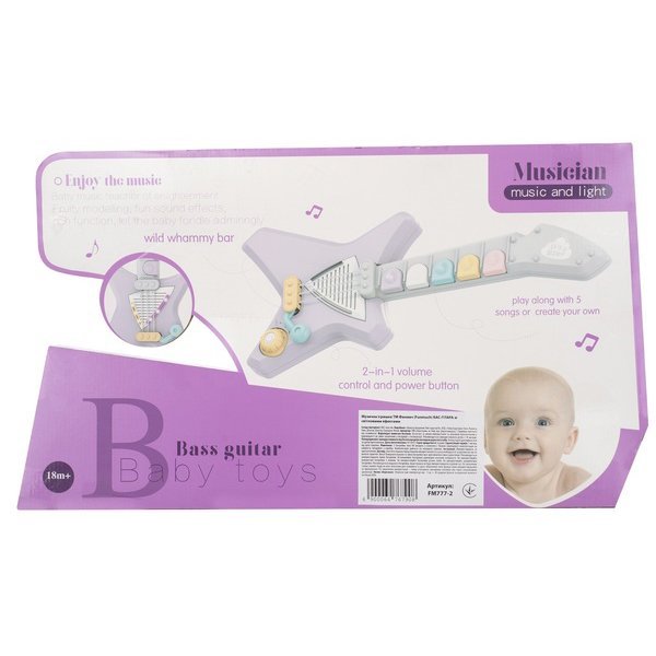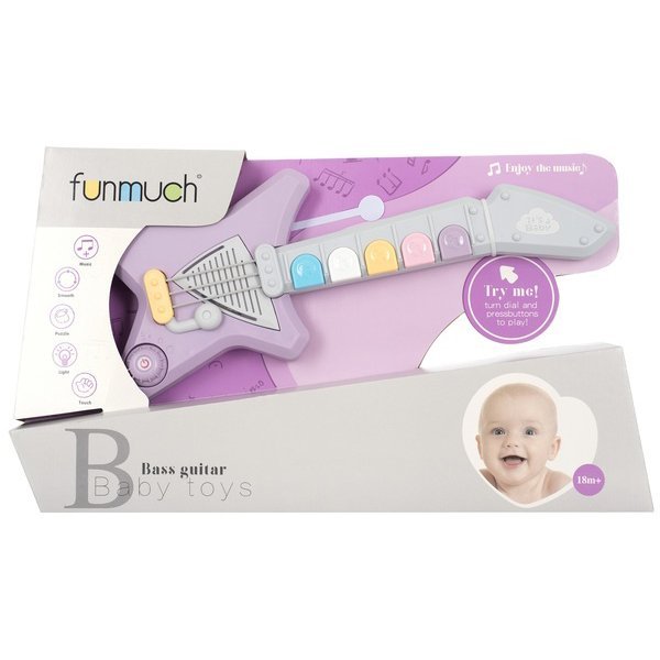 Zabawkowa gitara basowa Funmuch z efektami świetlnymi FM777-2. Posiada 5 przycisków muzycznych i 3 struny z modulatorem dźwięku, który aktywuje efekty świetlne i dźwiękowe. Dziecko może z łatwością tworzyć własną melodię, naciskając przyciski, lub grać 5 standardowych piosenek. Wyposażone w regulację głośności.